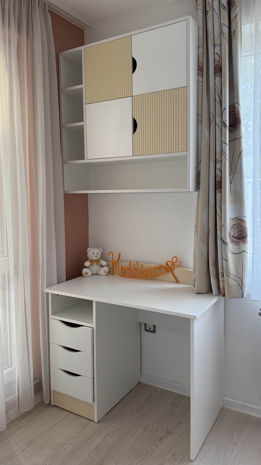 - Материали: корпус от бяло пдч, шапка и цокъл от масив в акцентен цвят