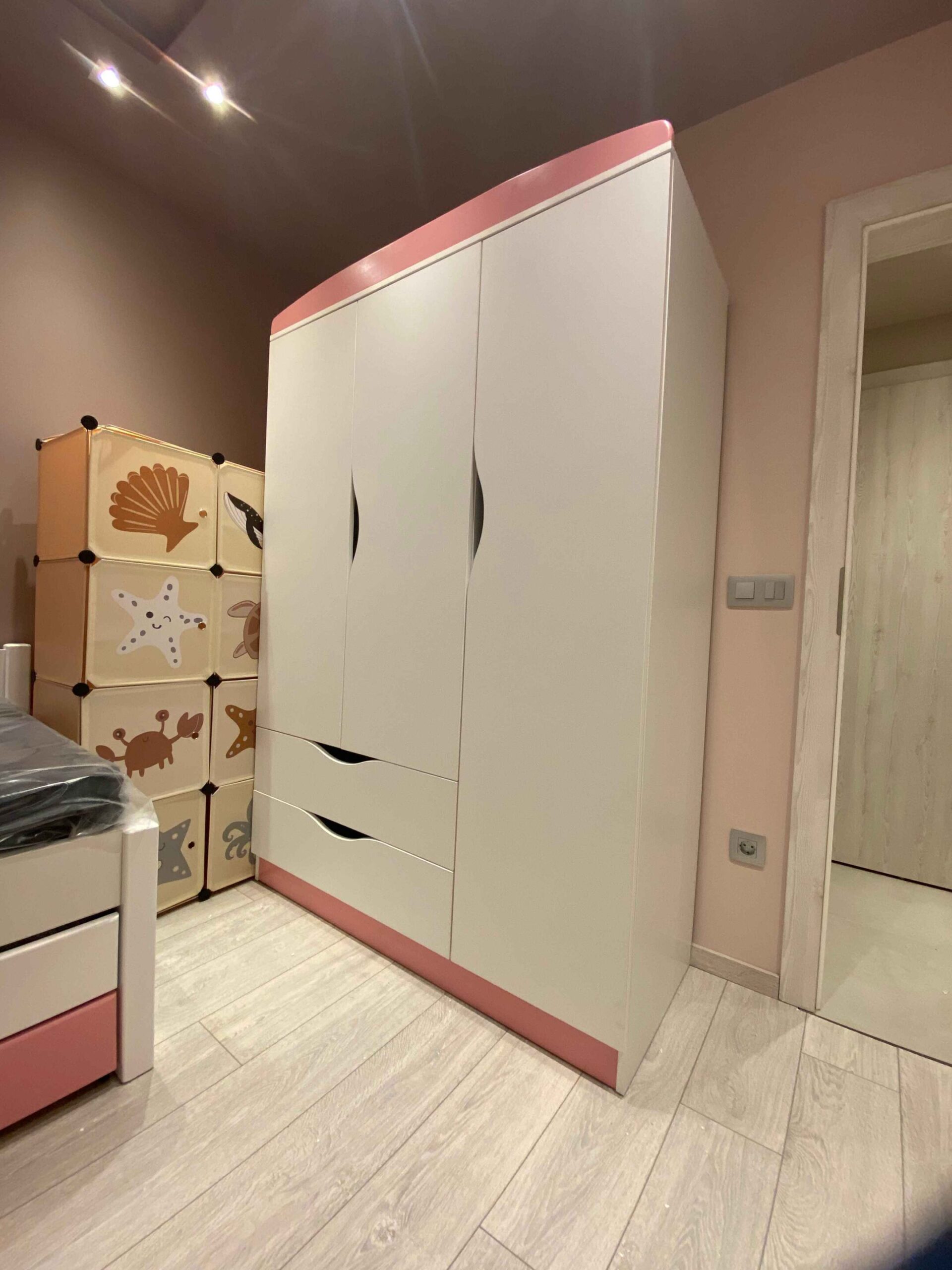 - разпределение: най-ляво крило – 2 рафта, средно крило – лост за закачалки, дясно крило – 3 рафта; 2 бр. чекмеджета